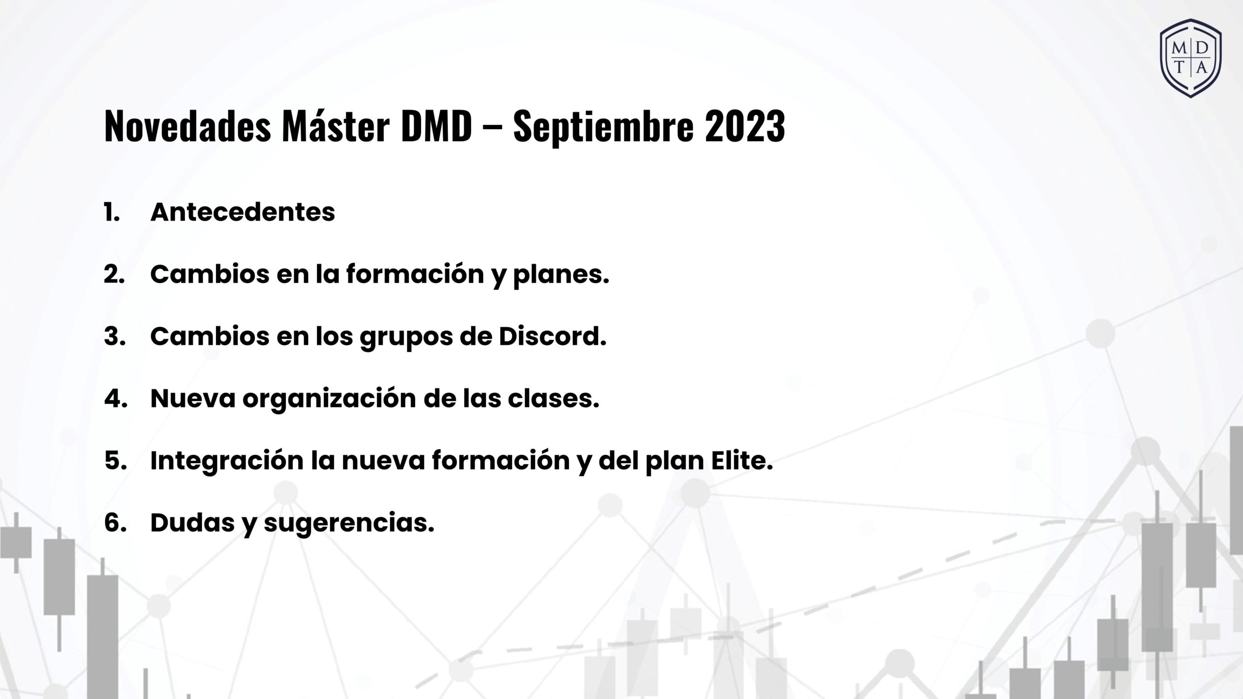 Tutorías Máster DMD En esta sección encontrarás los vídeos de todas las tutorías y sesiones en directo que hemos hecho hasta ahora ordenados de la más reciente a la más antigua. Aplicar filtro This category can only be viewed by members. Tutoría Grupal – Gestión de riesgo y el plan de negocio 13/09/2023 Tutoría Grupal – Avanzado: Planificación y estrategia. – Básico: Estrategias sistemáticas intermedias. 06/09/2023 Novedades para el nuevo ciclo formativo 2023-10 05/09/2023 Tutoría Grupal – Avanzado: Resumen del proceso de análisis. – Básico: Estrategias básicas (AXL, CNN y FIX). 30/08/2023 Tutoría Grupal – Avanzado: Proceso de análisis. – Básico: Protocolo para el análisis 23/08/2023 Tutoría Grupal – Avanzado: Etapas. – Básico: Stages 16/08/2023
